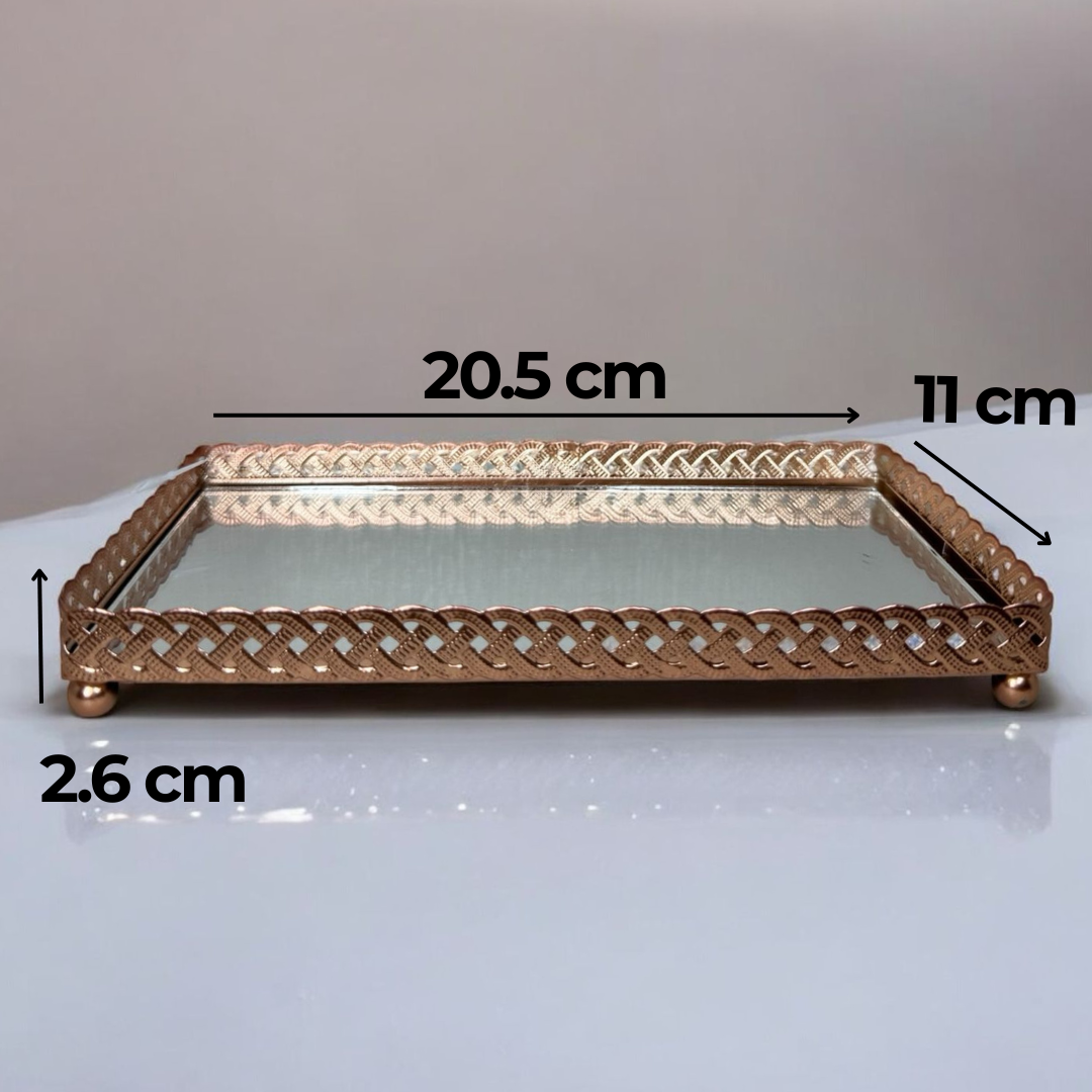As dimensões são 20,5cm de comprimento x 11cm de largura x 2,6cm de altura da borda. É compacta e perfeita para organizar ou decorar diferentes ambientes.