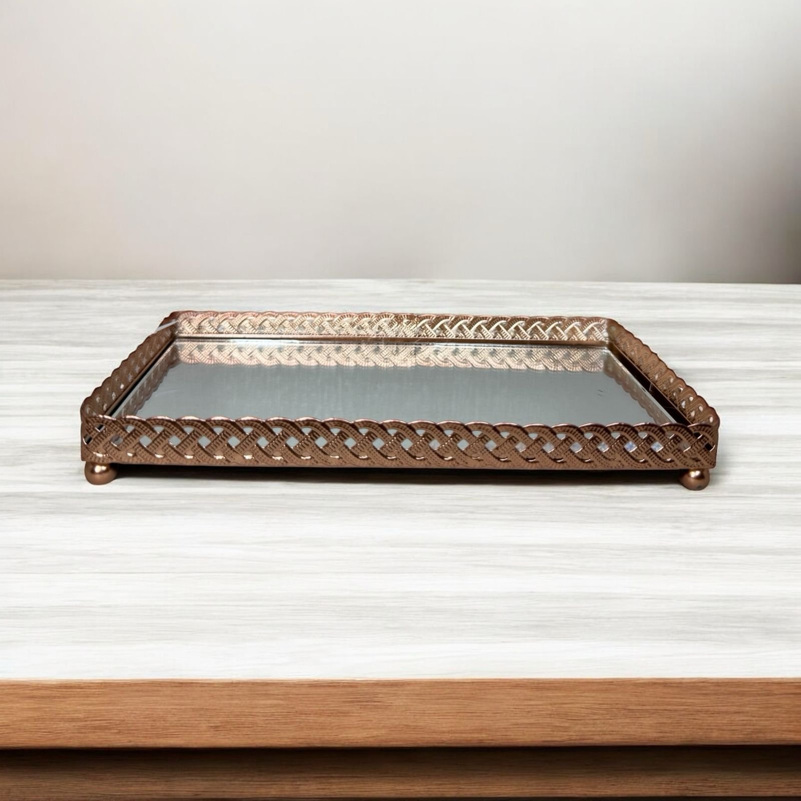 Sim. As bordas são feitas em ferro, o que garante firmeza e durabilidade, enquanto a base em espelho traz sofisticação sem comprometer a resistência.